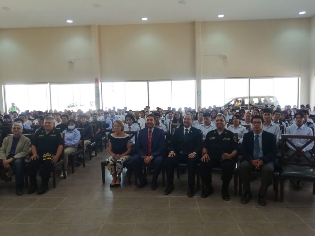 Posteriormente, la delegación fue recibida en el Auditorio por directivos, docentes y estudiantes del colegio, CETPro e instituto que forman parte de la propuesta educativa de la Fundación Pachacútec. Aquí nuestros ilustres visitantes dirigieron unas palabras a los estudiantes.